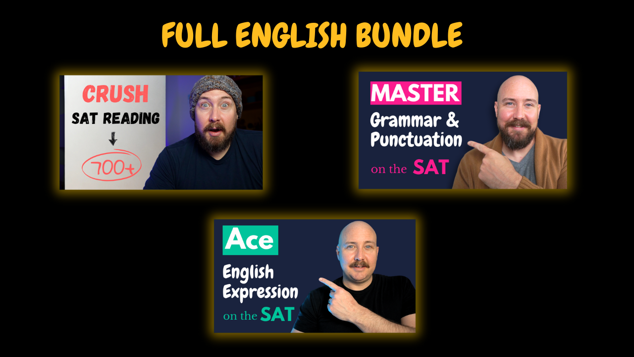 This all-in-one course bundle covers every English question type on the SAT—Reading, Transitions, Rhetorical Synthesis, Grammar, and Punctuation. With 300+ original questions in a Bluebook-style interface, detailed strategy lessons, downloadable cheat sheets, and ongoing course updates, this is your complete system for mastering the English section and raising your score.